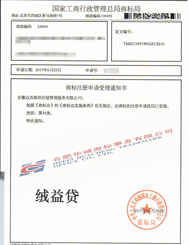 您委托我所代理商标注册申请,名称为“绒益贷”35类商标已被国家商标局受理。
