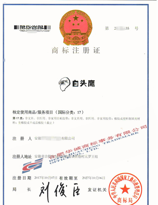 您委托我所代理商标注册申请,名称为“白头鹰” 17类商标注册证已下达。