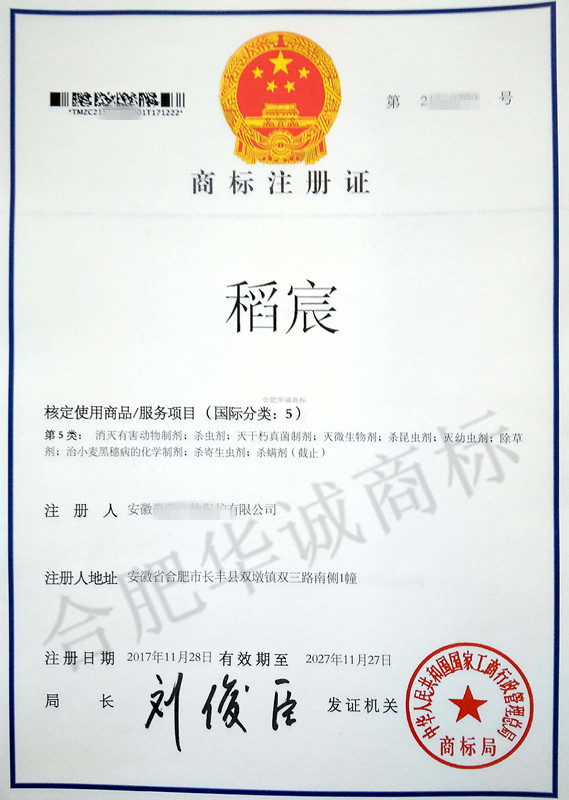 您委托我所代理商标注册申请,名称为“稻宸” 5类商标注册证已下达。