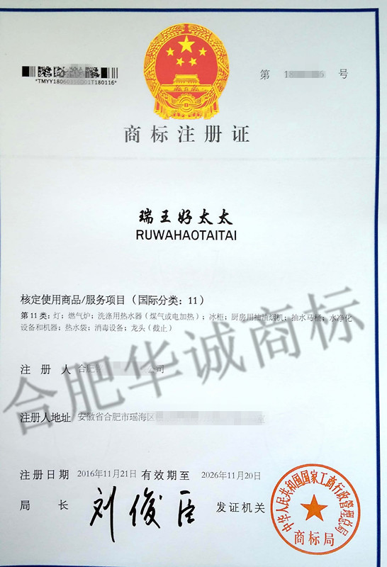 您委托我所代理商标注册申请,名称为“瑞王好太太” 11类商标注册证已下达。