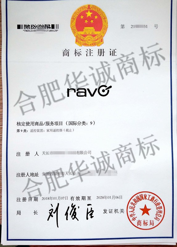 您委托我所代理商标注册申请,名称为“ravo” 9类商标注册证已下达。