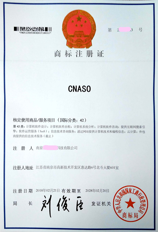 您委托我所代理商标注册申请,名称为“CNASO”35类、42类商标注册证已下达。