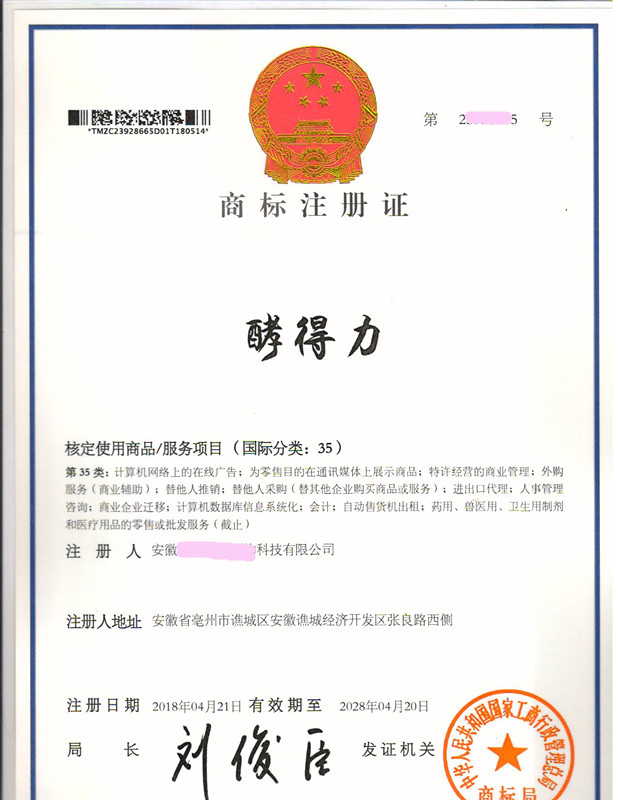 “酵得力”35类商标注册证下达