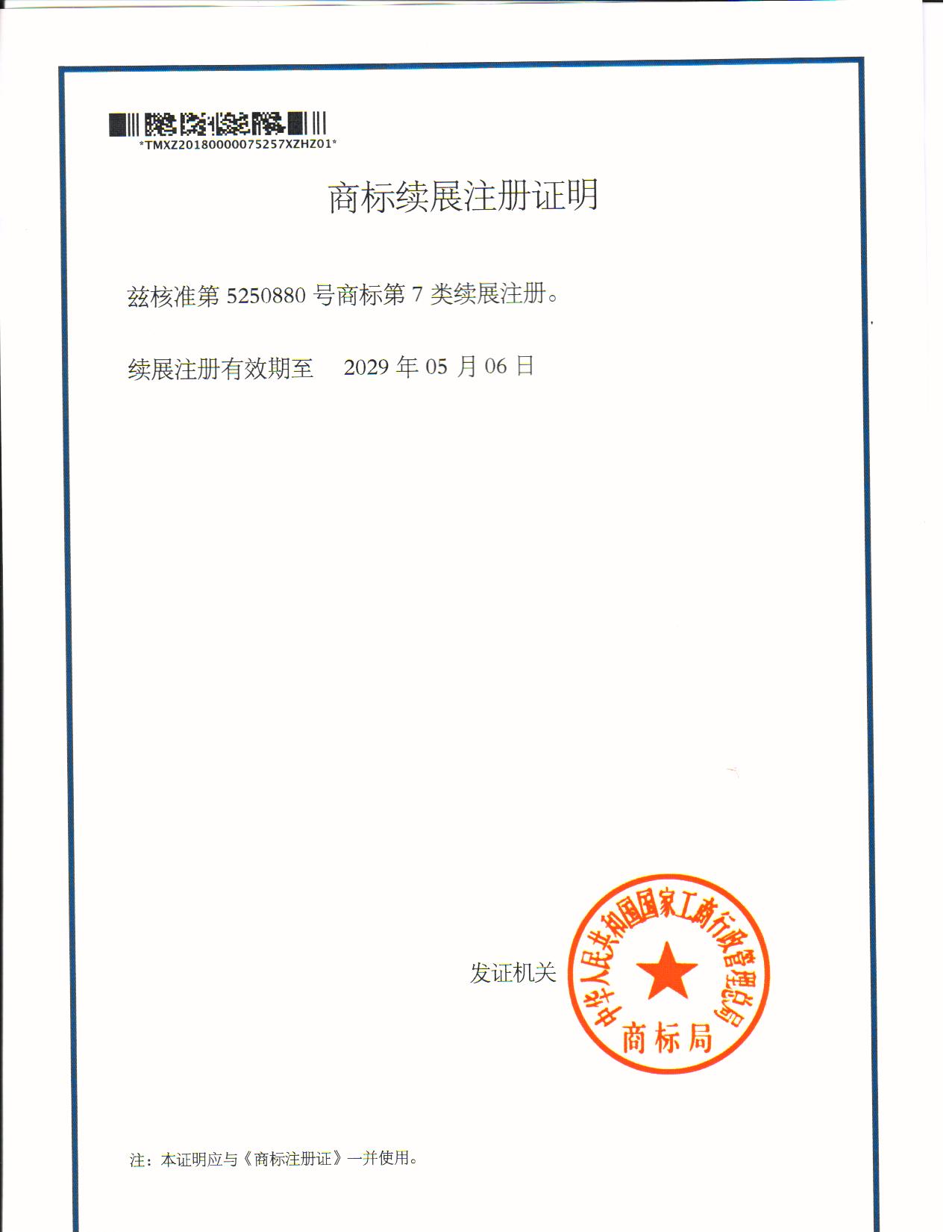 第“5250880”7类商标续展注册证明下达
