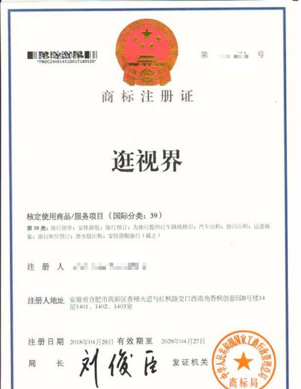 “逛世界”39类商标注册证下达