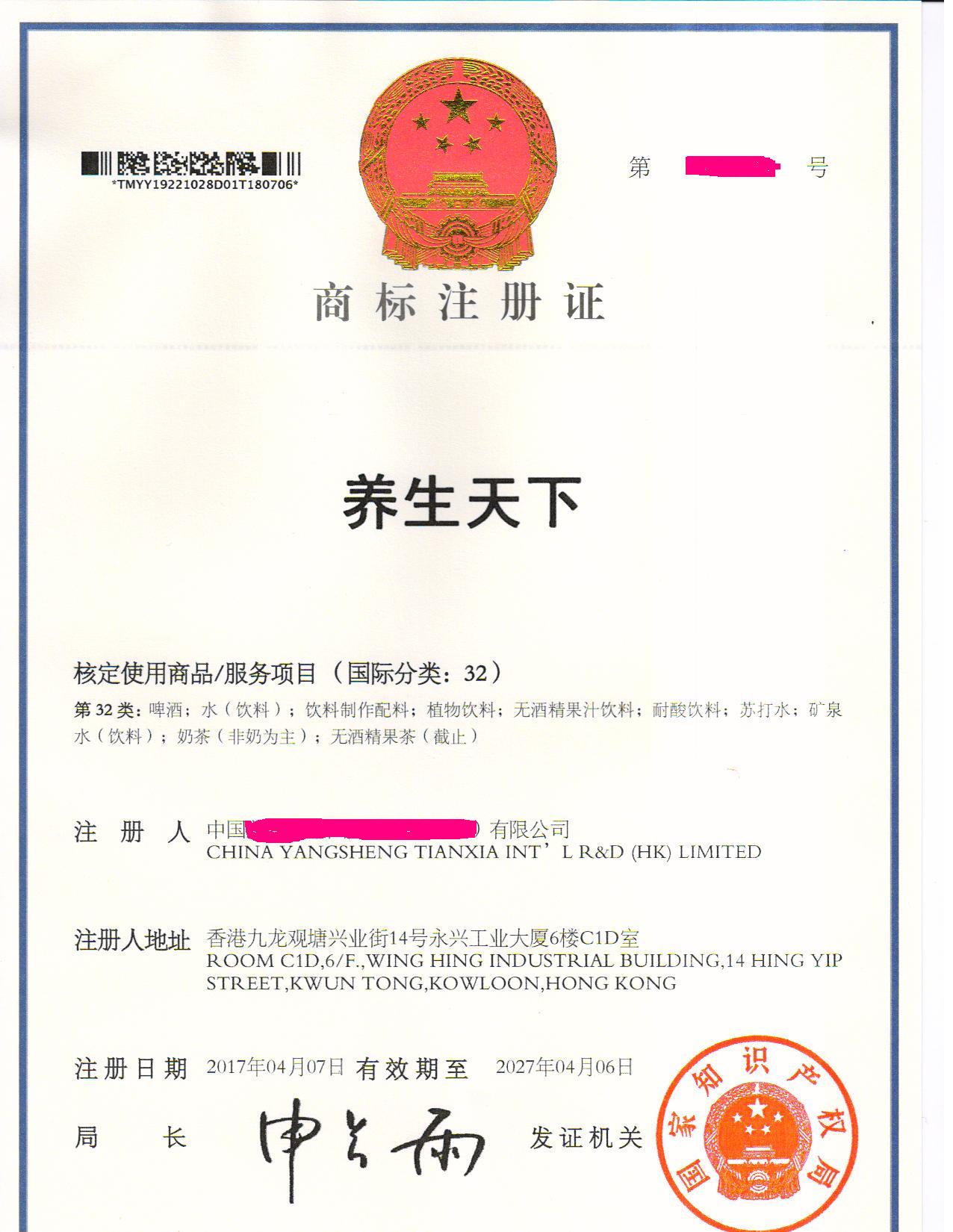 “养生天下”32类商标注册证下达