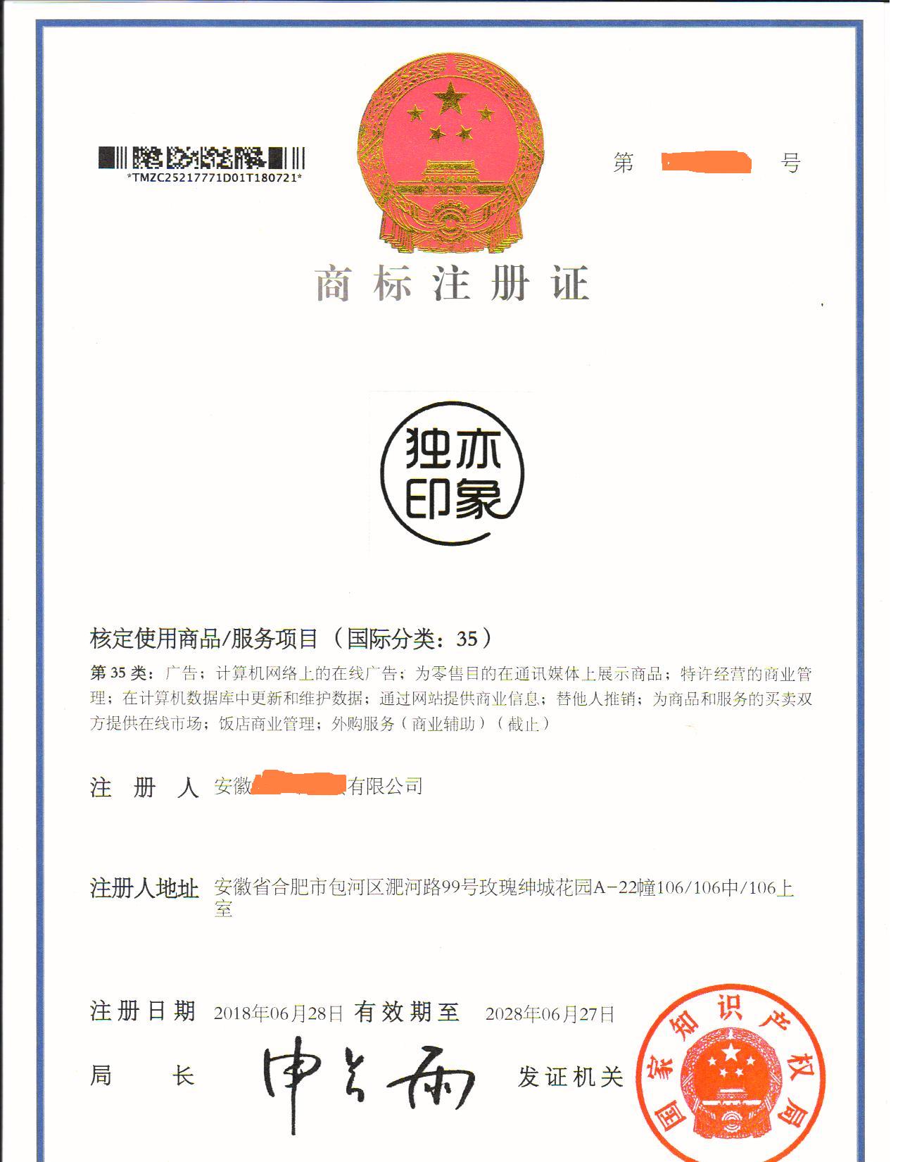 您委托我所代理商标注册申请,名称为“独亦印象”35类商标注册证已下达。