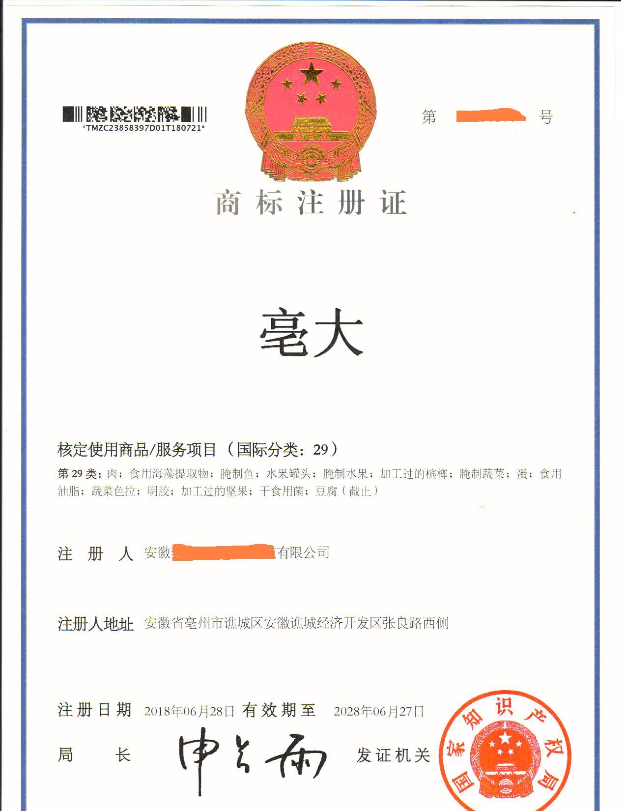“亳大”29类商标注册证下达