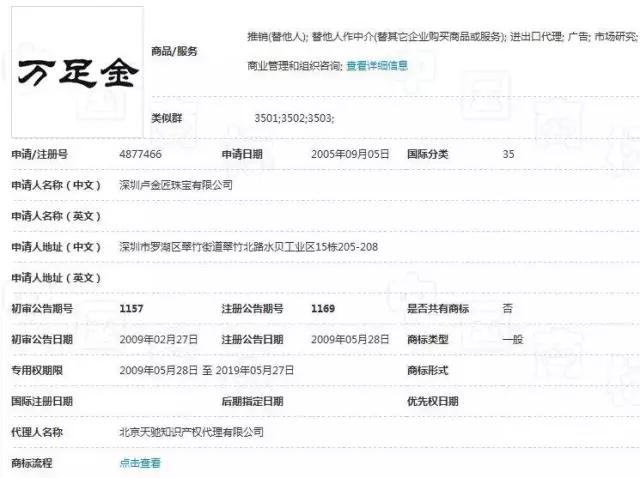 商标局共有18个“万足金”商标,除了深圳卢金匠珠宝有限公司名下的3个第35类“万足金”商标。大部分的“万足金”商标均为第14类(珠宝饰品)。